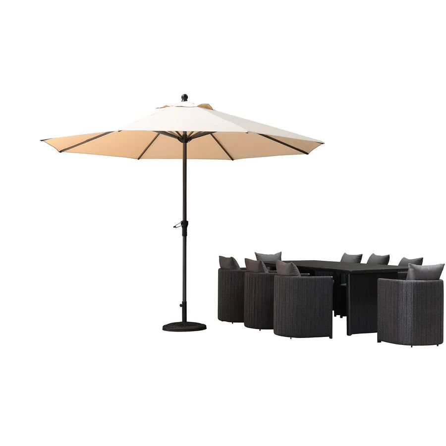 The PURPLE LEAF Aluminum Outdoor Patio Market Umbrella is designed with the outdoor dining enthusiast in mind. This center pole umbrella is crafted from high-quality aluminum, offering both strength and a sleek aesthetic. The innovative design allows it to be conveniently inserted into outdoor dining tables, providing shade and protection from the elements while you enjoy your meals alfresco. The canopy is made from a durable and water-repellent fabric that ensures long-lasting use. With an easy-to-operate crank system for opening and closing, this umbrella is not only practical but also enhances the ambiance of your outdoor space. It's the perfect accessory for creating a comfortable and stylish outdoor dining experience.