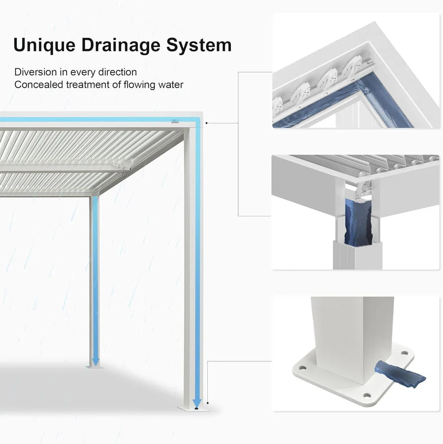 ● Concealed Drainage System: The Pergola's drainage system is discretely separated into four corners by a widened and thickened channel, providing uniform distribution. It allows for standing on uneven surfaces without any leakage.